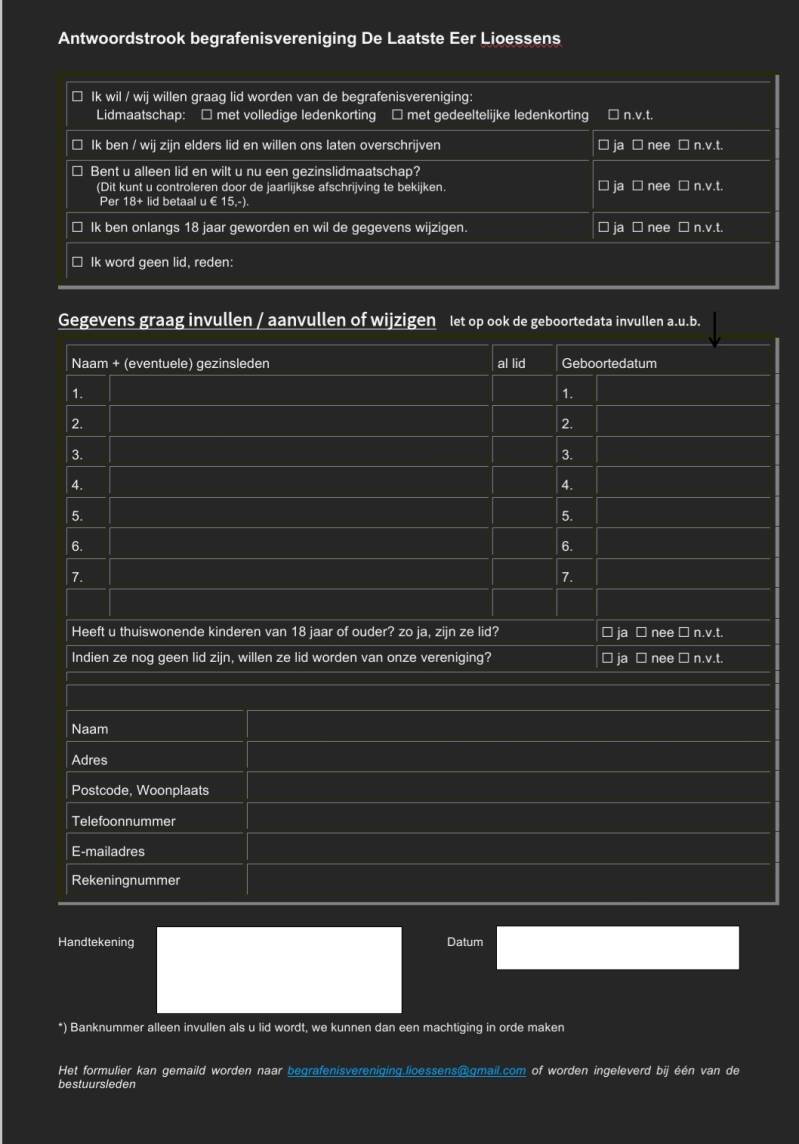 Bel of vraag één van de bestuursleden of stuur een mail aan begrafenisvereniging.lioessens@gmail.com.